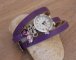 Montre bracelet en cuir violet au cadran argenté décoré d'une cascade de perles nacrées de diverses tailles dans les couleurs Mauve/violet/parme.