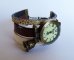 Montre au bracelet manchette composé de 3 beaux lacets de cuir de très belle qualité européenne : marron, naturel/beige et beige clair aux tâches dorées Le cadran est décoré d'un joli charme CLoche bronze doré.