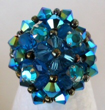 Une bague ronde, et bleue, très bleue...avec des toupies en cristal Swarovski turquoises métalliques et bleues qui encadrent des strass en cristal tchèque.