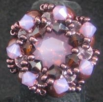 Autour d'un cabochon carré Swarovski Cyclamen Opal, des toupies sur 3 tons et des perles nacrées brillantes comme du chococat.
