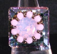 Elégance d'une bague composée d'un cabochon Swarovski Rose Water Opal (nouvelle couleur Swarovski) et de petites perles rondes Swarovski Rose opaque, montée sur un carré de 20mm en cristal Swarovski Vitrail Light, aux beaux reflets roses et pastels...
