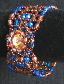 Au centre du bracelet, une couronne de perles en cristal entoure un strass pointu Swarovski Golden Crystal, le bracelet est large (3 cm) avec un motif dessiné par les facettes bleues et les facettes ambre fumé poudré.