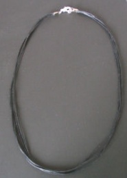 Ce collier est à réaliser avec les éléments fournis dans le kit : 4 cordons noir en coton ciré (0.75 mm de diamètre), deux attaches à écraser (une simple pince suffit), un fermoir à mousqueton et deux anneaux. Les apprêts sont argentés. La longueur fournie est de 50 cm, à recouper selon la taille souhaitée.